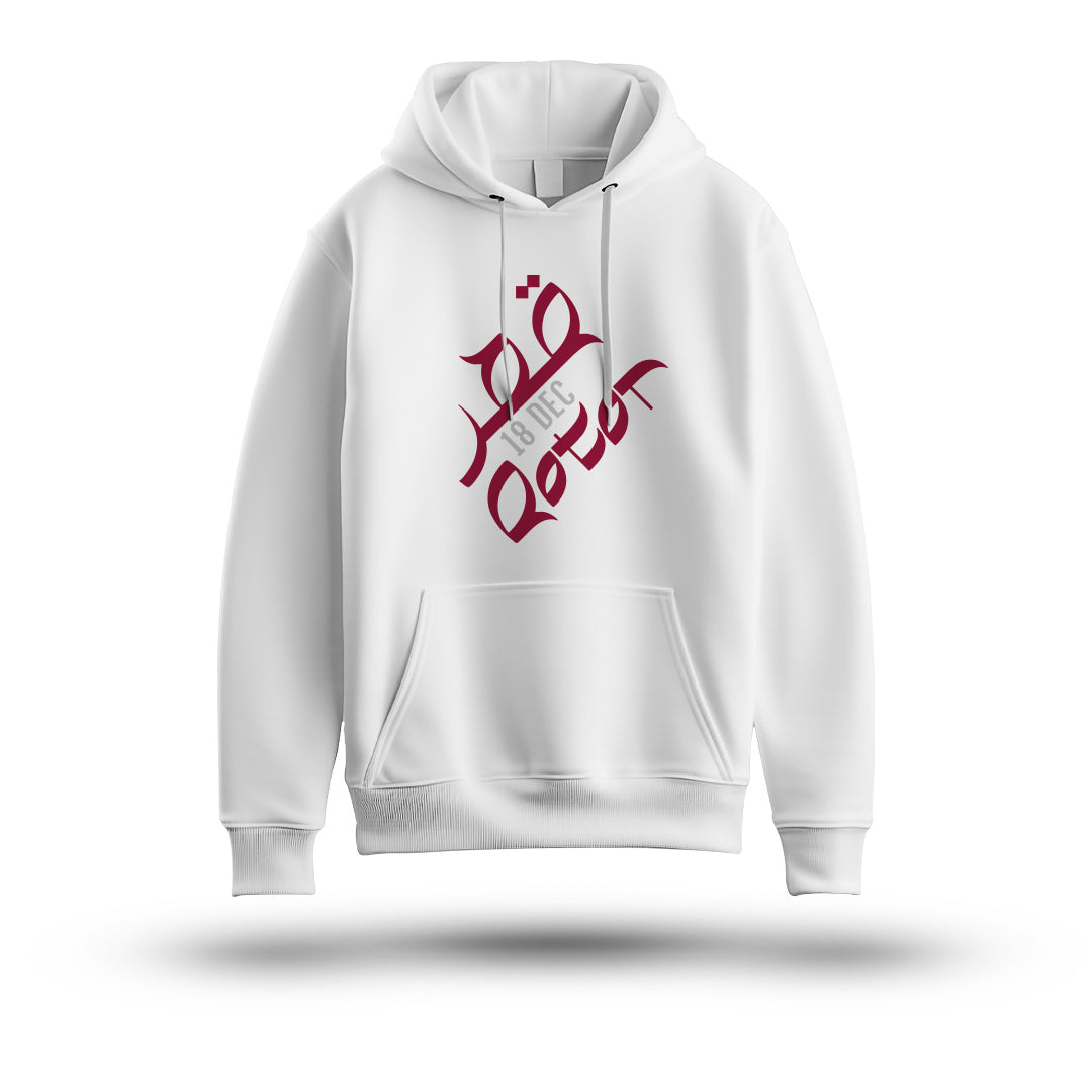 هودي ابيض مطبوع عليه قطر بالعنابي